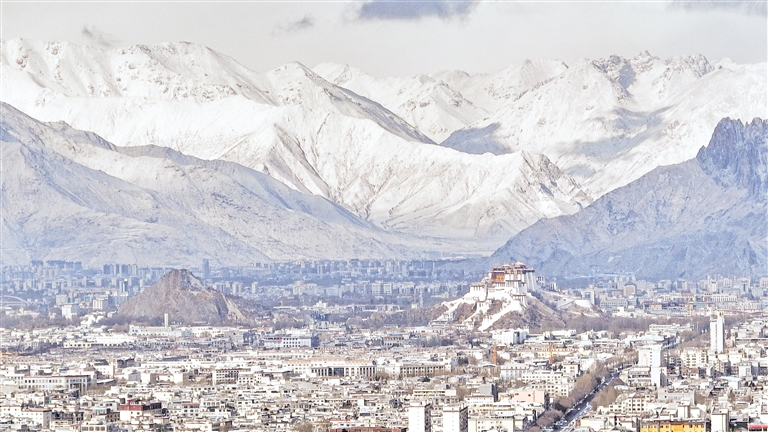 这是2月16日拍摄的降雪后的拉萨市区。2月16日,拉萨市区迎来立春节气后第一场降雪。新华社发