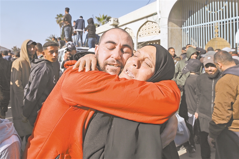 2月15日,在加沙地带南部城市汗尤尼斯,获释的巴勒斯坦人与亲人拥抱。
