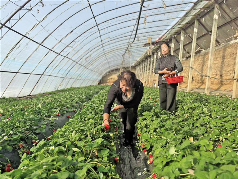 市民在草莓采摘园采摘草莓。 本报记者 王瑞 摄