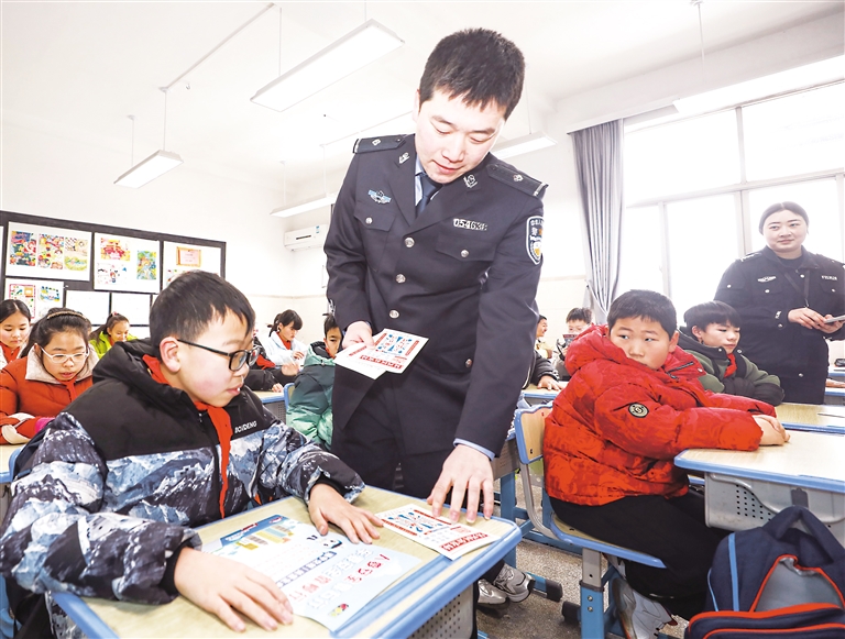2月14日,东林镇派出所民警在东林二小开设防诈课堂,给学生们普及防诈知识。新学期伊始,浙江省湖州市吴兴区东林镇派出所、应急消防管理站、卫生院等多个部门联合各中小学开展“开学第一课,安全记心间”主题教育活动,增强学生们的安全意识,助力平安校园建设。 新华社发