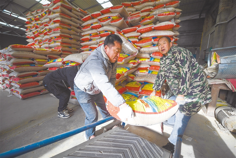 2月13日,在宁夏鹏丰种业有限公司仓储作业车间,工作人员将一袋袋种子搬上传送带,准备装车外运。本报记者 马楠 王洋 摄