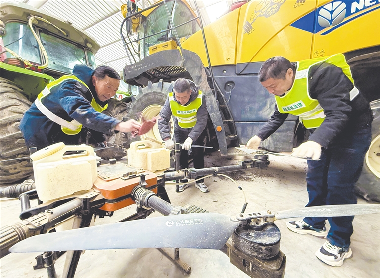 2月13日,贺兰县红苹果园农机专业合作社技术人员检修农业机械设备。 本报记者 马楠 王洋 摄