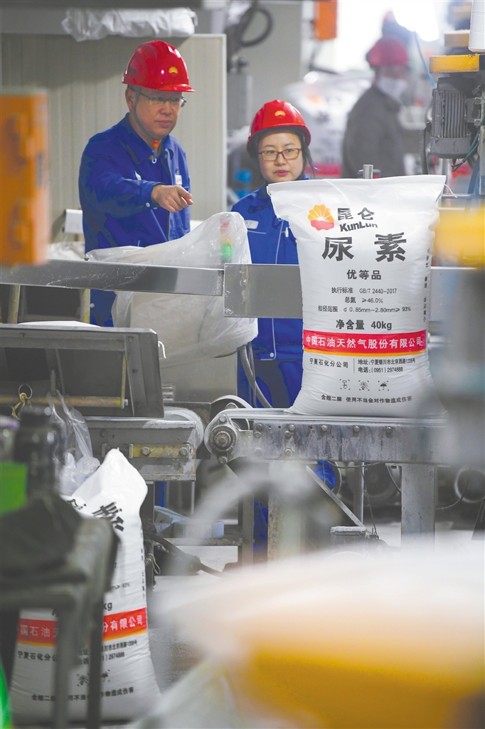 2月14日,在中石油宁夏石化公司化肥一部包装车间,一袋袋尿素将走下生产线,奔向田间地头。 本报记者 马楠 王洋 摄