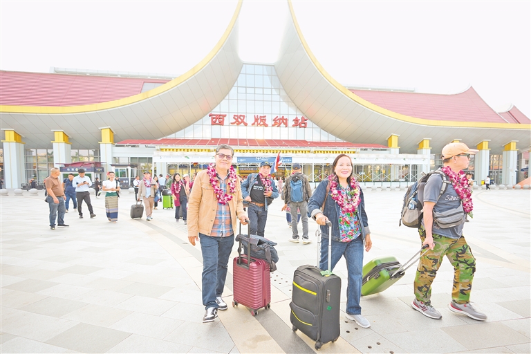 2月18日,来自泰国和老挝的游客走出中老铁路西双版纳站。