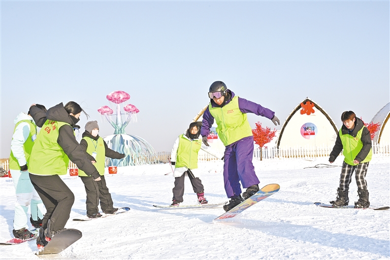 “重心放在前腿上,手臂向前伸直,腰背挺直,下巴微抬,膝盖微弯,这样可以保持平衡。”2月5日,在银川阅海滑雪场,24岁的滑雪教练辛旭正指导滑雪初学者控制滑速,沿着雪坡慢慢向下滑,感受单板滑雪的乐趣。