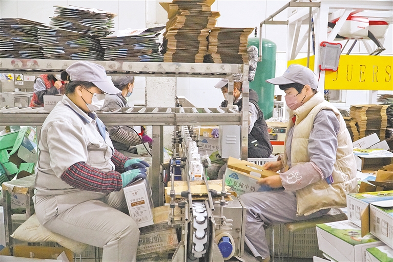 近日,永宁工业园区内,宁夏北方乳业有限责任公司包装生产线上工人对纯牛奶进行包装。永宁工业园区内赛迈科、启元药业、四季鲜、新百物流、京东智能产业园等企业开足马力忙生产。宁夏日报报业集团全媒体记者 张艳丽 摄