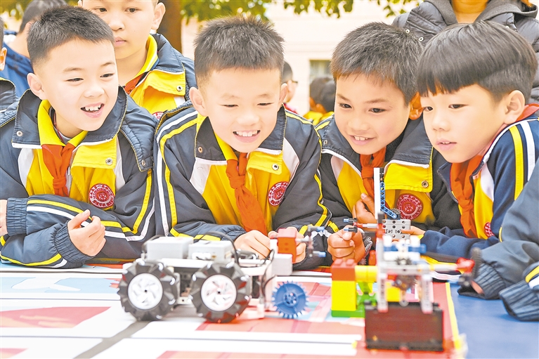 2月17日,在广西兴业县第一实验小学,学生们通过智能编程操控机器车。当日,全国各地举办了多种多样的“开学第一课”主题活动。新华社发