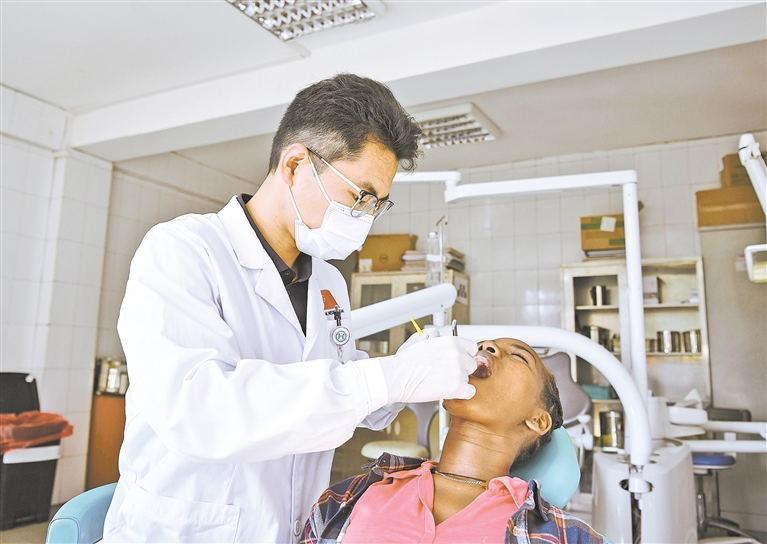 2月14日,在位于埃塞俄比亚首都亚的斯亚贝巴的蒂鲁内什-北京医院,中方口腔科医生高崇为患者做检查。