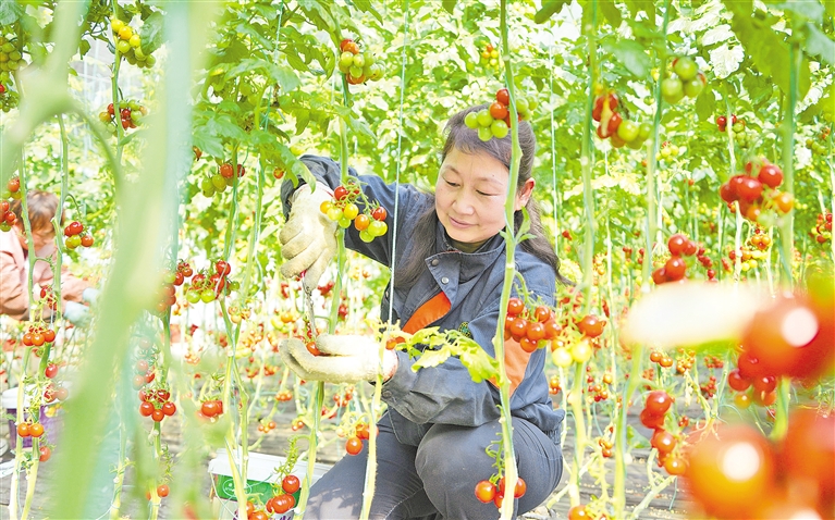 2月19日,在山东省潍坊市寒亭区前阙庄村,村民在采摘西红柿。