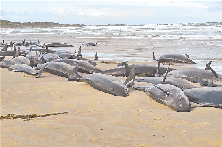 这是2月19日在澳大利亚塔斯马尼亚岛阿瑟河附近的一处海滩拍摄的搁浅的伪虎鲸。澳大利亚政府官员19日说,逾150头伪虎鲸在塔斯马尼亚岛一处偏远海滩搁浅,救援工作困难重重。 新华社/美联