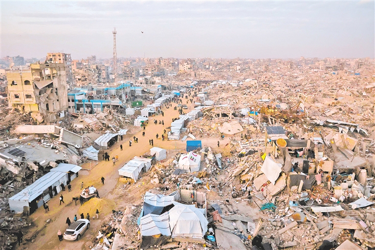 2月18日,人们在加沙地带杰巴利耶的废墟中行走。联合国、世界银行和欧洲联盟18日就巴勒斯坦加沙地带重建发布评估报告,指出重建工作需要超过500亿美元。这份《损失和需求评估报告》估算,加沙地带今后10年恢复和重建工作需要532亿美元,头3年需要200亿美元。在532亿美元中,约299亿美元将用于修复受损建筑及其他基础设施,其中住房重建需要约152亿美元;191亿美元将用于弥补社会和经济损失,涉及卫生、教育、商业、工业等领域。 新华社/法新