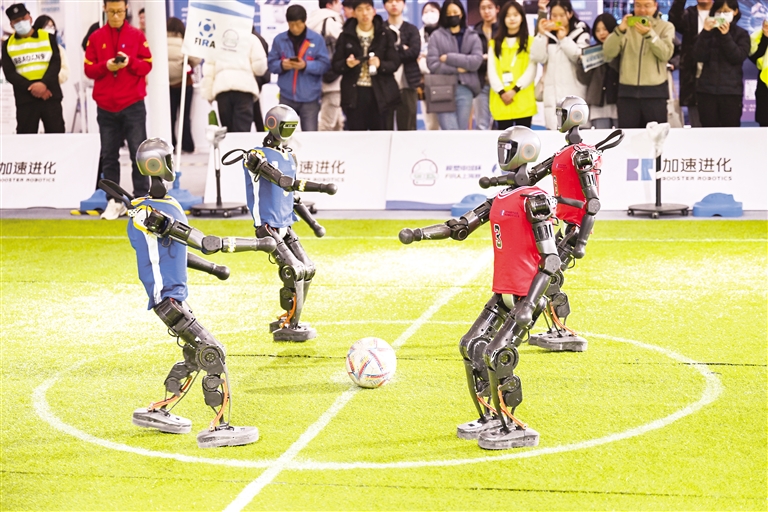 2月21日,机器人在2025全球开发者先锋大会现场踢足球。2月21日至23日,以“模塑全球 无限可能”为主题的2025全球开发者先锋大会在上海举办。据悉,全球开发者先锋大会源自世界人工智能大会,定位为开发者“社区的社区”,已举办两届。 新华社发