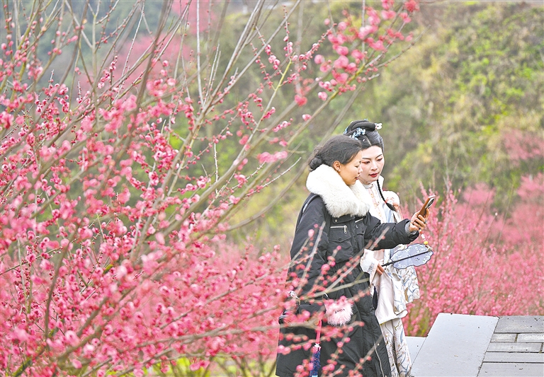2月23日,游客在湖北省宣恩县仙山贡水旅游区的梅园踏青赏梅。