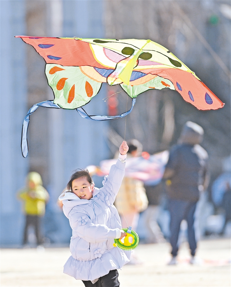 2月23日,一名小朋友在山东省滕州市市民公园放风筝。