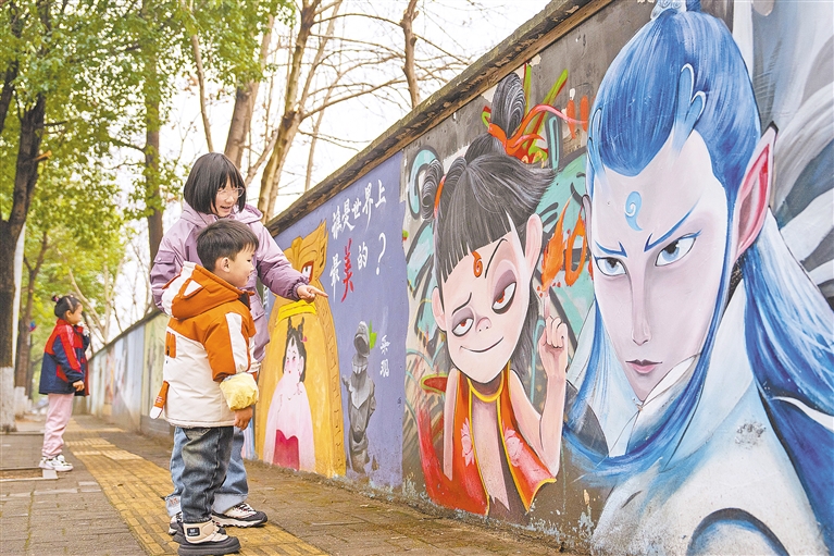 2月23日,市民在长沙市岳麓区岳麓街道五星村观看哪吒主题墙绘。近日,随着《哪吒之魔童闹海》电影热映,全国多地的艺术爱好者发挥奇思妙想,根据动画电影创作多种形式的作品。 新华社发
