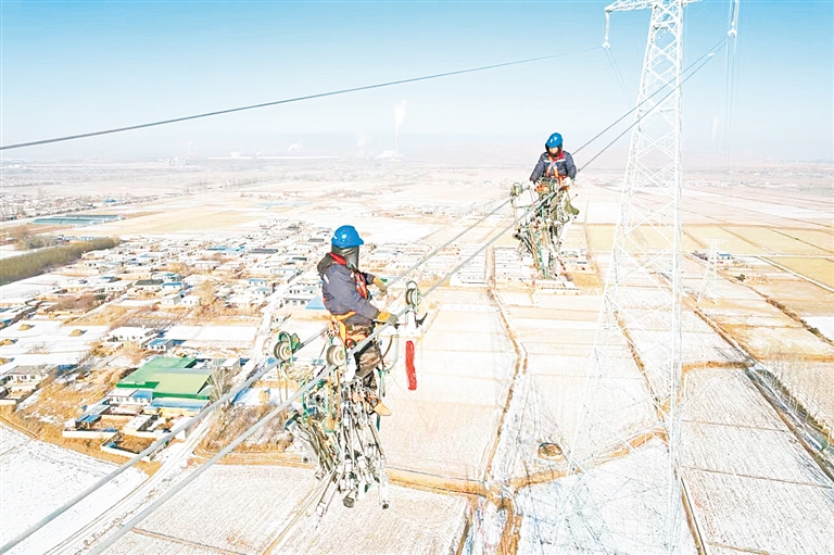 施工人员在导线上进行间隔棒安装作业。 本报记者 鲁延宏 摄