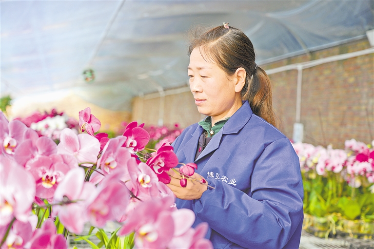 2月25日,在固原博弘农业基地大棚,一株株蝴蝶兰绚丽绽放,员工何巧红在仔细打理植株。该基地共有12栋大棚,其中花卉大棚仅春节期间就销售了4000余株蝴蝶兰。 宁夏日报报业集团全媒体记者 郭小立 见习记者 杨恺 摄
