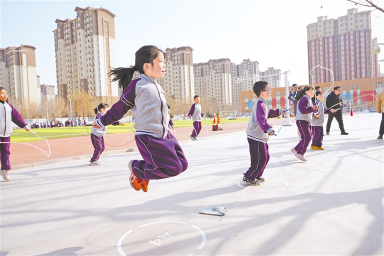 2月24日,银川市金凤区第十八小学操场上,学生在AI智慧体育运动仪器感应区内跳绳锻炼。随着智慧校园的快速发展,科技助推体育教学质量稳步提升。 本报记者 刘惠媛 付杨 摄