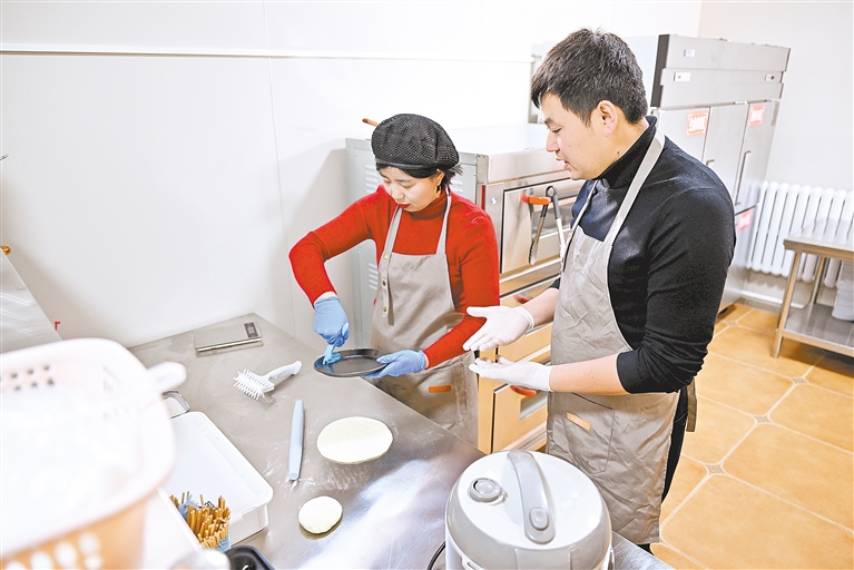 顾占林(右)指导员工制作披萨,从刷油到配料比例,每一个步骤都严格把控。