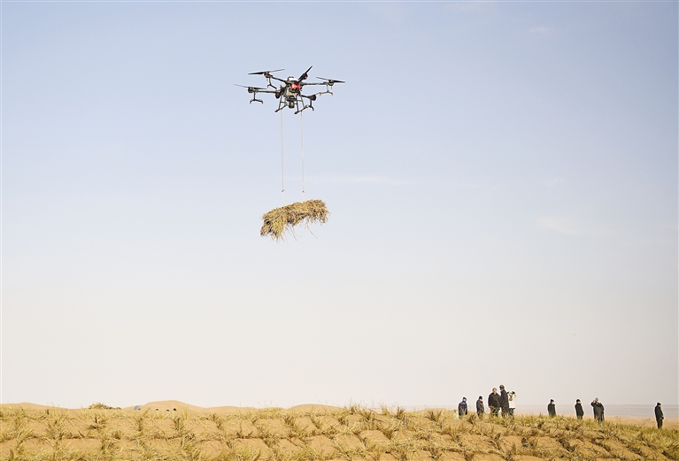 2月28日,治沙工人使用无人机调运稻草。当日,内蒙古阿拉善盟2025年“三北”六期工程防沙治沙项目暨三大沙漠林草锁边带“合龙”战开工仪式在阿拉善右旗举行。