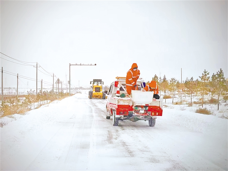3月2日,工作人员在铺撒融雪剂。当日,盐池县除雪工作有条不紊开展,累计出动公路养护人员180人次,各类除雪机械、车辆51台(辆)次,确保道路畅通。 宁夏日报报业集团全媒体见习记者 贺静 摄