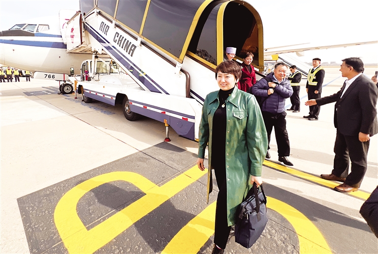 3月3日,出席十四届全国人大三次会议的在宁全国人大代表乘机抵达北京。 本报记者 左鸣远 摄