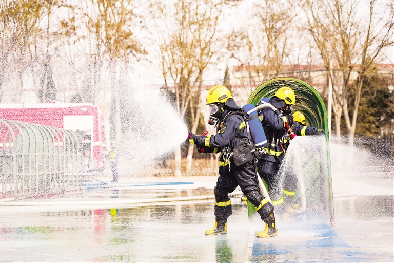 消防救援人员打开水枪进行灭火演练。