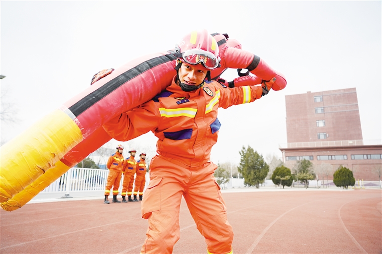 消防救援人员负重跑。