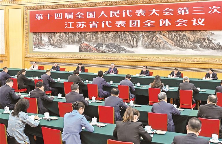 在听取大家发言后,习近平作了发言。他首先表示赞成政府工作报告,对江苏工作予以肯定,希望江苏落实好挑大梁的责任,努力取得新的更大成绩。