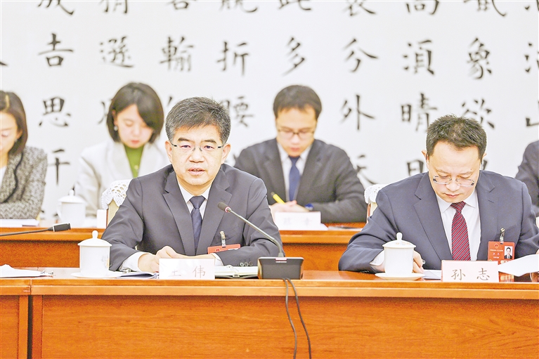 3月6日上午,宁夏代表团举行开放团组活动,继续审议政府工作报告并集体接受媒体采访。图为王伟代表发言。 本报记者 党硕 摄