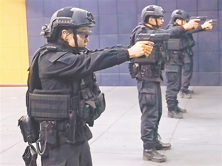 执勤的脚步不停,训练的节奏更不能乱,基础体能、力量、耐力是打底的“主食”,警务技能、射击、攀登则是提升战斗力的“硬菜”。上午的射击训练场,纪宁三点一线瞄准靶心,子弹呼啸而出;下午的搏击馆或是体能操场,她又化身活力四射的“运动健将”,挥汗如雨。