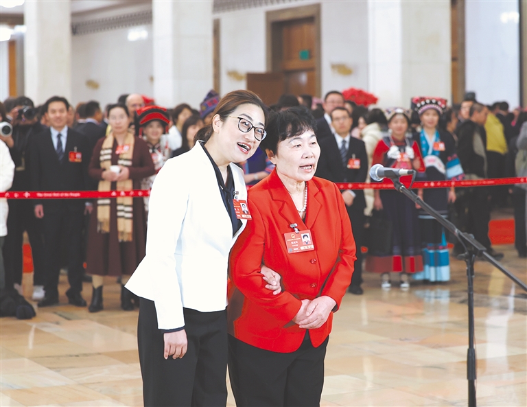 3月8日,第十四届全国人民代表大会第三次会议第二场“代表通道”集中采访活动在北京人民大会堂举行。这是全国人大代表盛弘(左)和杨宝玲向广大妇女致以节日祝福。 新华社发