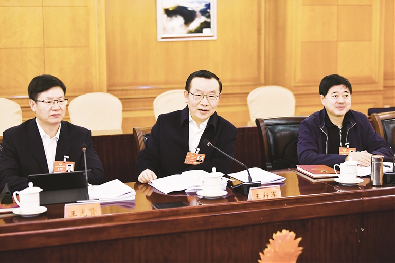 3月8日,住宁全国政协委员王新军(中)在界别小组讨论“两高”工作报告中发言。 本报记者 王鼎 摄