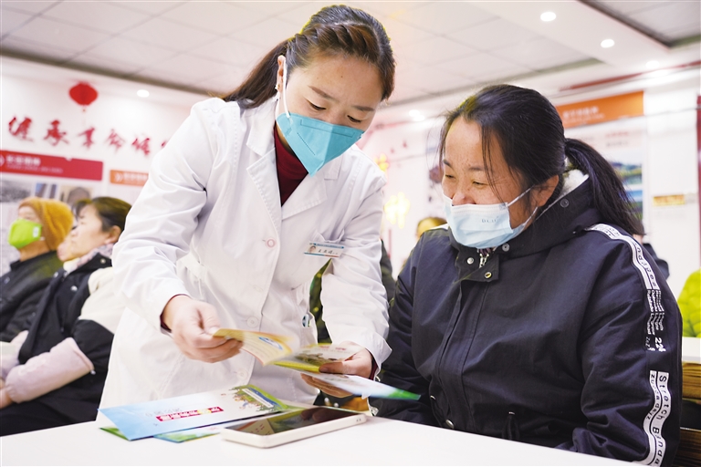 在共享社区新时代文明实践站内,辖区卫生院的工作人员向居民宣传健康养生知识。 本报记者 马赛尔 摄
