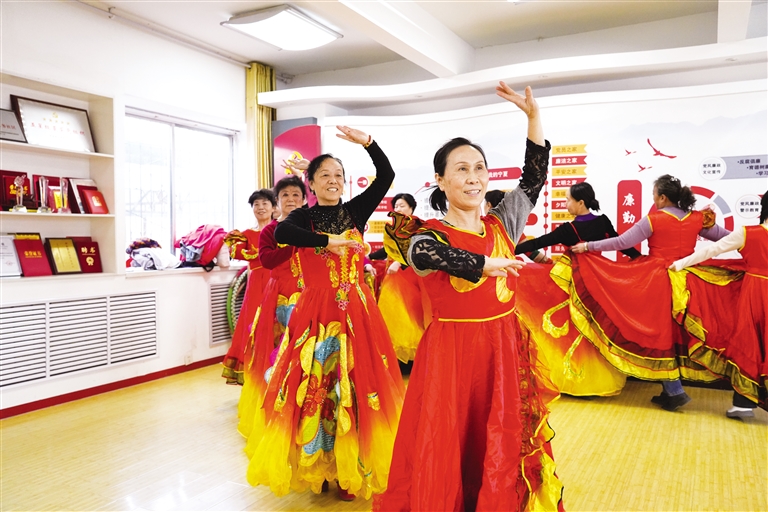 在共享社区文体活动室内,“共享蓝天”艺术团的成员们在排练舞蹈。本报记者 马赛尔 摄