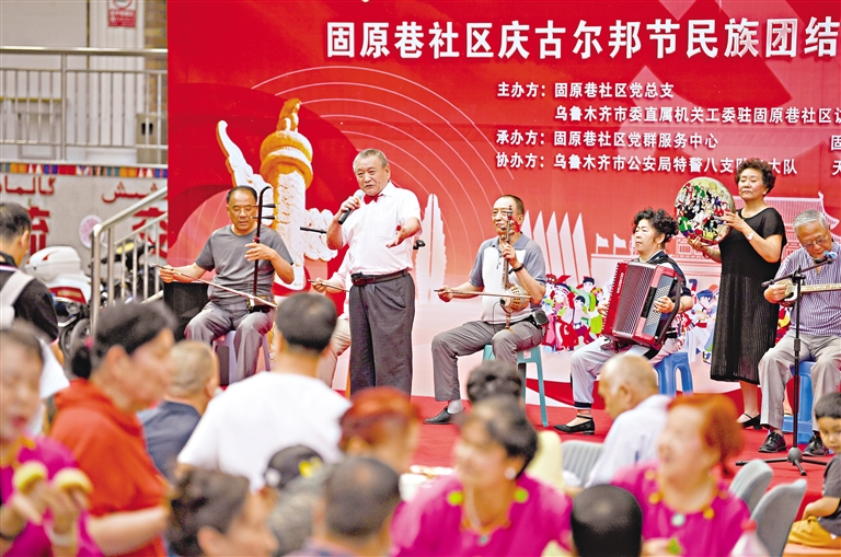 2024年6月25日,社区老年艺术团演员演唱《颂歌献给亲爱的党》。当日,固原巷社区开展“庆古尔邦节民族团结一家亲百家宴”联谊活动。石榴云·新疆日报记者 汤永 摄