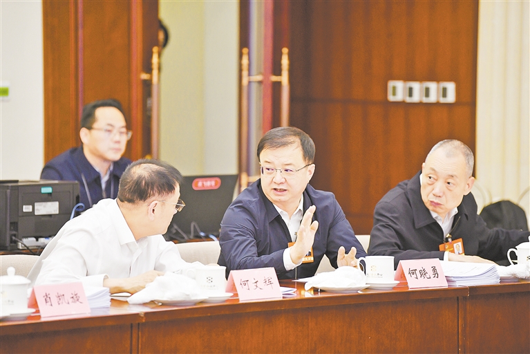 3月7日,住宁全国政协委员何晓勇(中)围绕关注的热点问题参加协商讨论。 本报记者 王鼎 摄