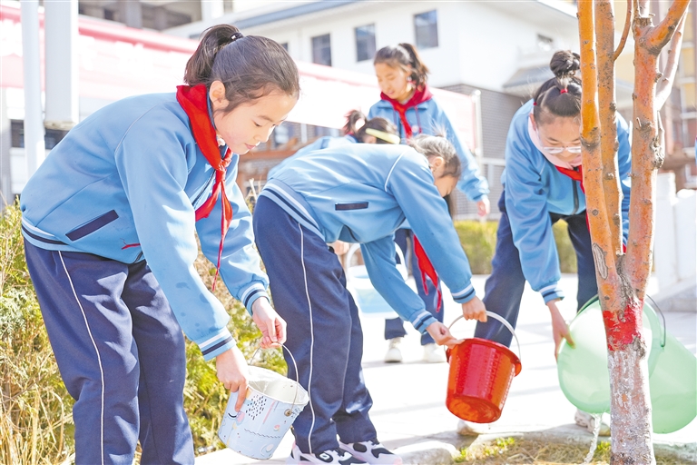 3月12日,同学们浇灌小树苗,用实际行动爱护树木。当天是植树节,银川市西夏区实验小学北校区以“植树节,一起和小树‘浇’朋友”为主题,开展一系列丰富多彩的活动,引导学生爱护树木,树立环保意识。 本报记者 李宏亮 摄