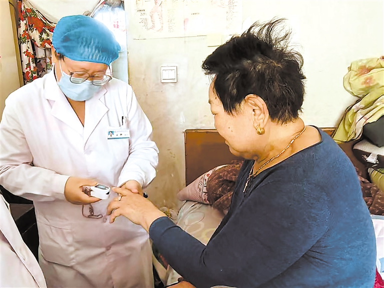 刘桂兰今年80岁,患有高血压、糖尿病、心律不齐等多种慢性疾病,是王静家庭医生团队重点签约对象。一个月前,老人不慎摔倒致胯骨骨折,术后在家静养。王静团队每周都会上门一到两次,为她测血糖、量血压。