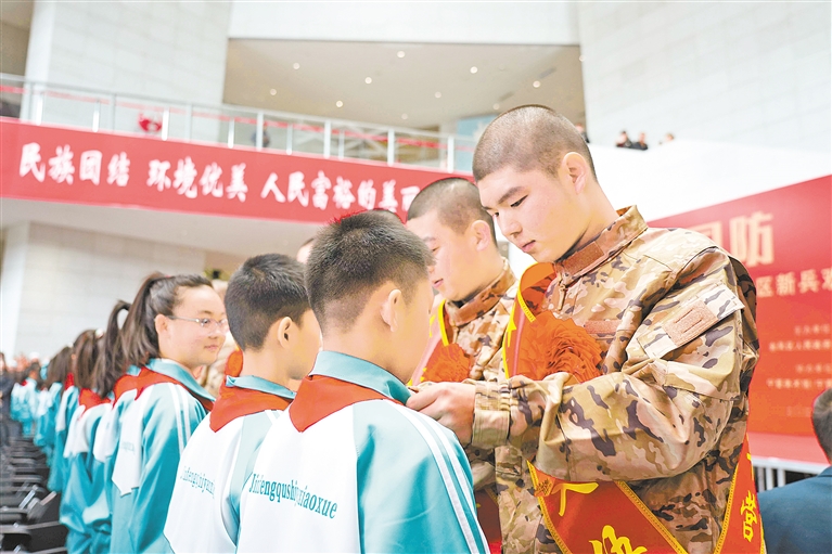 3月14日,入伍新兵为少先队员系上了红领巾。当日,银川市金凤区新兵欢送暨国防教育宣讲大会在宁夏美术馆(宁夏书画院)举行。 本报记者 杨淑琼 马丽 摄