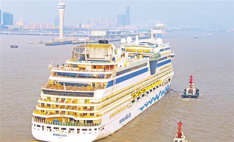 3月16日,“阿依达·星辰号”邮轮航行在上海吴淞口国际邮轮港水域(无人机照片)。当日,德国AIDA邮轮公司旗下“阿依达·星辰号”和皇家加勒比的“海洋光谱号”靠泊上海吴淞口国际邮轮港,两艘大型国际邮轮共带来近4800名外籍游客入境。这是上海吴淞口国际邮轮港自2011年开港以来创造的单日入境外籍游客数的最高纪录。 新华社发