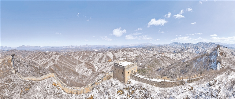 3月16日拍摄的雪后的金山岭长城(无人机全景照片)。3月15日的一场春雪过后,位于河北省滦平县的金山岭长城银装素裹,美如画卷。新华社发