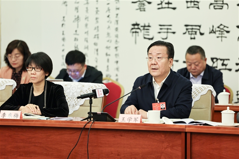 3月9日,十四届全国人大三次会议宁夏代表团举行全体会议,审议最高人民法院、最高人民检察院工作报告。图为王学军代表发言。