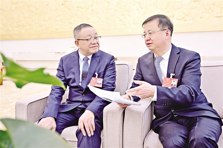 3月9日,住宁全国政协委员童安荣(左)与何晓勇讨论政府工作报告,积极履职尽责。