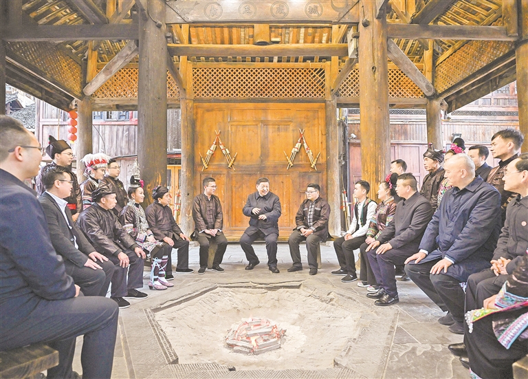 3月17日至18日,中共中央总书记、国家主席、中央军委主席习近平在贵州考察。这是17日下午,习近平在黔东南州黎平县肇兴侗寨考察时,同村民们亲切交流。 新华社记者 翟健岚 摄