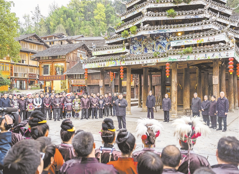 17日下午,习近平来到黔东南州黎平县肇兴侗寨考察。寨门口,身着民族盛装的村民唱起侗族大歌欢迎总书记。习近平饶有兴致地听取侗族大歌的艺术起源、曲调特点、演唱形式等方面介绍。随后,沿着村寨路道察看侗寨风貌和旅游商铺,不时驻足与店主、游客、村民互动交谈。在侗族文化展示中心,他详细了解侗族历史、风俗和服饰、建筑等特色文化保护传承情况。在侗乡特色产业基地,他观看蜡染工艺流程,对蜡染合作社坚持顾客至上、质量第一的运营理念给予肯定。习近平指出,少数民族文化是中华文化不可或缺的组成部分,既要保护有形的村落、民居、特色建筑风貌,传承无形的非物质文化遗产,又要推动其创造性转化、创新性发展,让民族特色在利用中更加鲜亮,不断焕发新的光彩。