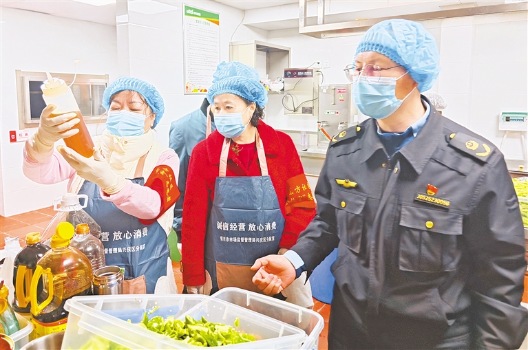 “冷藏柜生熟分区要更严格,建议贴上分类标签。”“这批食用油的生产日期需要再核对。”志愿者郑艳丽戴着白手套,指尖轻触灶台缝隙检查油渍残留,食堂负责人频频点头记录。这支由玉皇阁北街市场监督管理所、东方社区食安专干和社区志愿者组成的8人队伍,每周都会不定时突击到访。不仅检查食堂进货相关单据,与运营方共同把好食材采购第一道关,还会对菜品口味等提出专业建议,并及时反馈给食堂主厨。