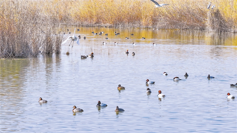 3月20日,成群的候鸟在沙湖嬉戏、觅食。随着天气转暖,沙湖景区迁徙鸟类增多。沙湖是中亚候鸟迁徙的重要中转站,全球9条候鸟迁徙路线中2条经过沙湖。 本报记者 王刚 摄