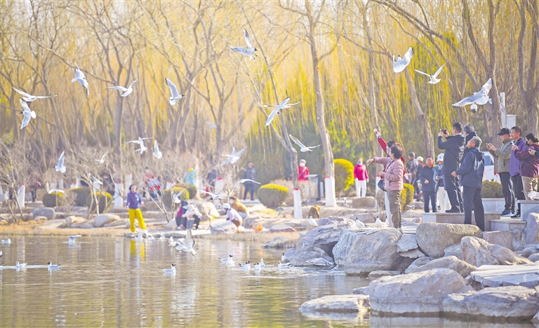 3月20日清晨,银川海宝公园,湖畔的垂柳泛起绿意,市民在投喂红嘴鸥。当日,我国迎来二十四节气中的春分。此时节,太阳直射赤道,南北半球昼夜均分,寒暑平衡,标志着春季进入中期,天气渐暖。 本报记者 马楠 王洋 摄