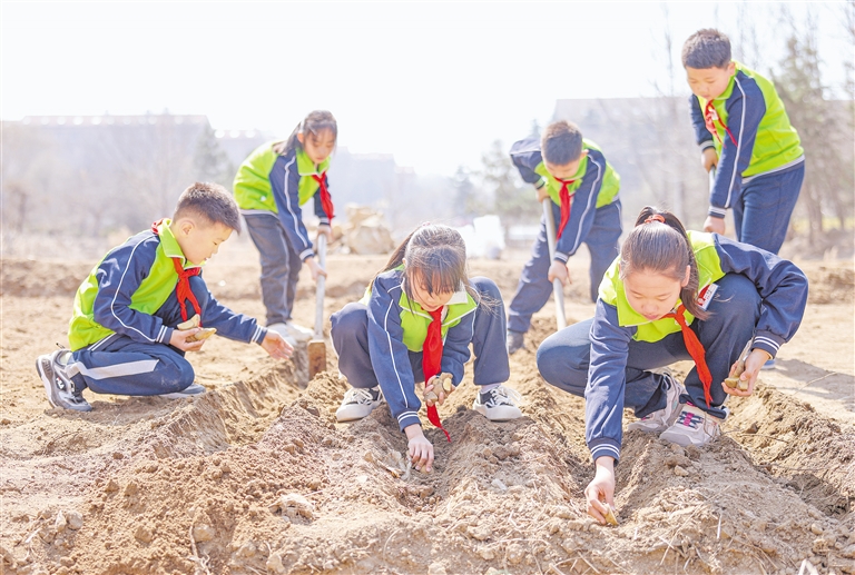 3月20日,在山东省荣成市府新小学劳动实践基地,学生们在菜园里种土豆。当日是春分节气,各地开展各类春分节气品民俗活动。 新华社发